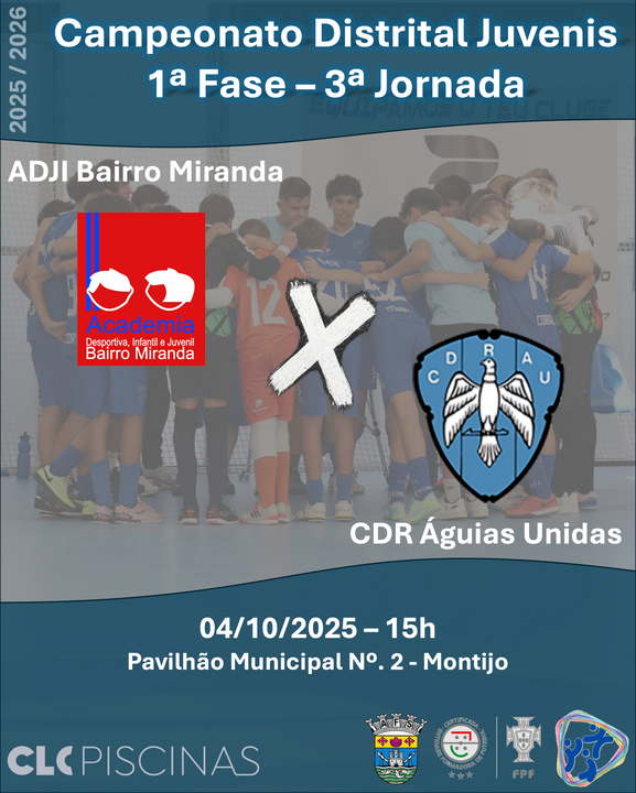 Depois da derrota por 7‑2 frente ao CR Sobredense na 2.ª jornada, o CDR Águias Unidas prepara-se para visitar o ADIJ Bairro Miranda na 3.ª jornada do Campeonato Distrital Sub17 da AF Setúbal (Série A).